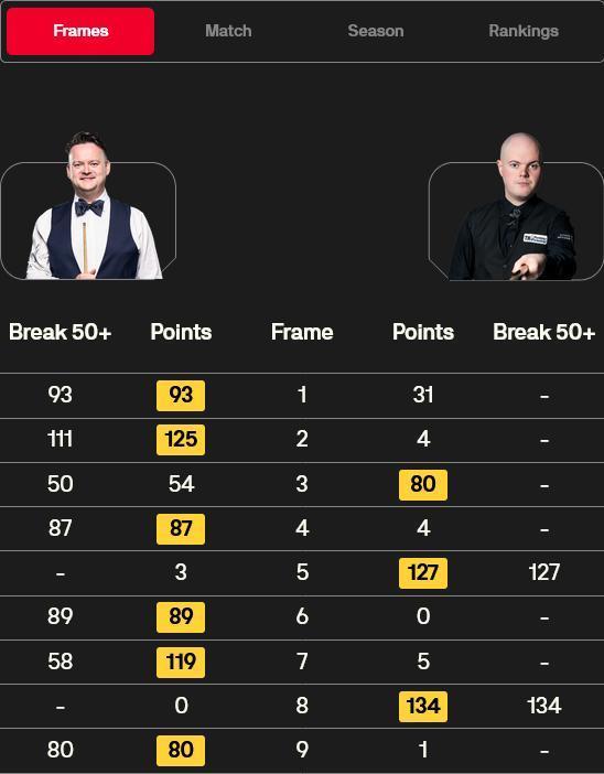 7号种子肖恩-墨菲凭借1杆破百和6杆50+,大比分6-3治服打出2杆破百的埃利奥特-斯莱塞,晋级8强。