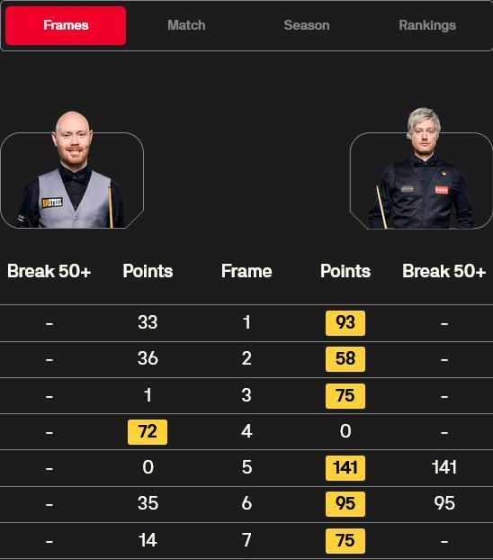 尼尔-罗伯逊在对阵11号种子G-威尔逊的比赛中,开场连下3局,大比分3-0卓越。“老司机”扳回一局后,“澳洲火炮”打出1杆破百和1杆90+,再下3局,雷同大比分6-1挺进1/4决赛。