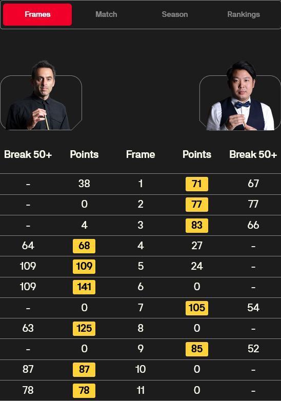 第二时段中,5号种子罗尼-奥沙利文与12号种子张安达亦然打满11局。比赛中,两边王人是火力全开。张安达凭借3杆60+,开场连胜3局,大比分3-0卓越。随后,“火箭”打出1杆60+和2杆破百,连扳3局,将大比分追成3-3。张安达在第七局和第九局再打出2杆50+,奥沙利文在第八局打出单杆63分,这么,张安达大比分5-4最初拿到赛点。不外尔后,“火箭”再轰2杆70+,解救赛点后,大比分6-5逆转晋级1/4决赛。