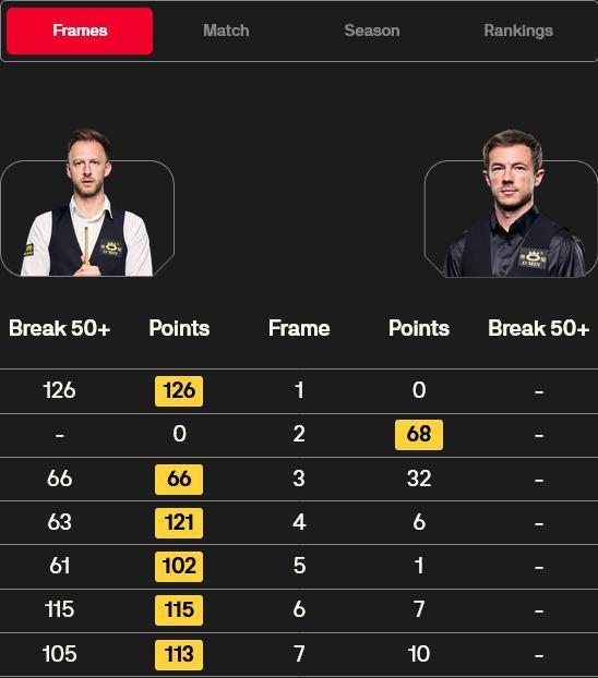 在第一阶段中,3号种子贾德-特鲁姆普火力全开,凭借3杆破百和3杆60+,大比分6-1治服好友杰克-利索夫斯基,第一个闯进8强。