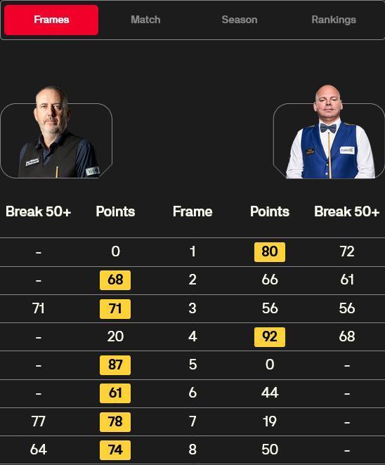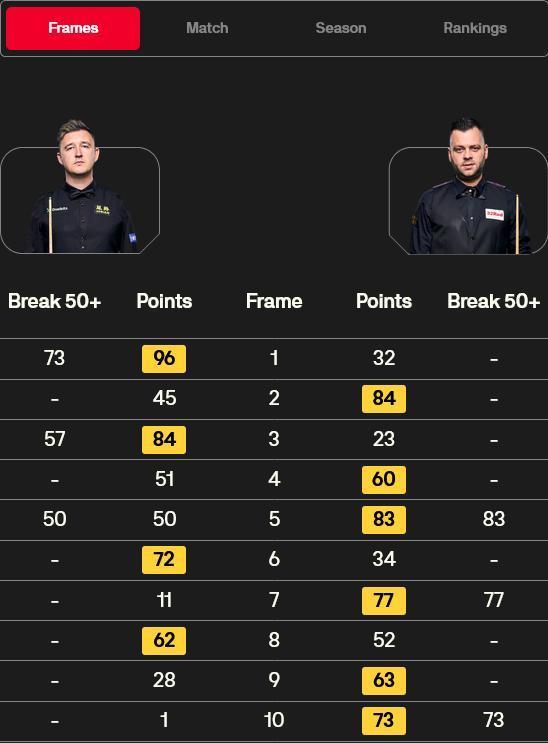 9号种子马克-威廉姆斯对阵斯图尔特-宾汉姆。比赛中,“二师兄”天然在前四局打出4杆50+,但他也曾跟只打出1杆70+的“金左手”战成大比分2-2参加中场休息。休息回来,马叔再轰2杆60+,一波四连鞭后,大比分6-2参加8强。