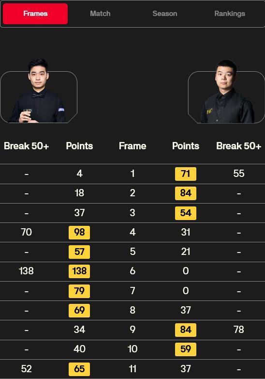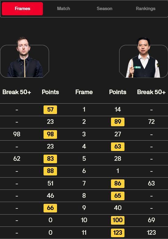 当日临了限度的一场比赛是一场“中国德比”。庞俊旭开场打出1杆50+,连胜3局,大比分3-0卓越。尔后,斯佳辉打出1杆破百和1杆70+,一波五连鞭后,大比分5-3最初拿到赛点。庞俊旭打出1杆70+、连救2个赛点后,斯佳辉在决胜局中打出单杆52分,再胜一局,大比分6-5险胜晋级8强。